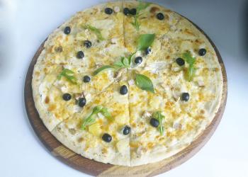 тісто, вершковий соус, сир, куряче філе, ананас, маслини чорні, моцарела, пармезан, зелень