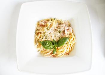 спагеті, куряче філе, печериці, вершковий соус, пармезан